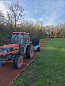The process of inserting the mats includes stripping off any turf that we can reuse, some of the turf can’t be reused as it may be too worn or weakened by tree roots. We then dig out the area and insert a timber frame, we then insert some hardcore into the framework and firm it in using our whacker plate. We then apply a thin layer of the crushed stone too level the surface, this is also firmed in. We finally cut the Astro turf to size and screw it down to the framework. Once the mats are brought into play we maintain them by using our power brush a couple of times a week to keep them tidy.