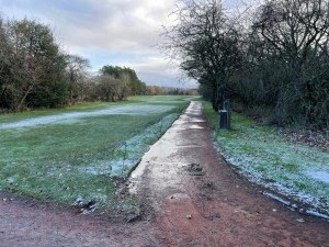 Following the Christmas period we’ve had our first bout of bad weather, bringing Snow in the early hours of Sunday morning, This falling on already frozen ground, it then turned to rain leading to 40mm, around an inch and a half of precipitation over a short period of time. As you can see from the photos below there was a lot of standing water around the golf course. With the rain falling on top of the frozen ground some areas may take more time to clear that usual. The areas that have drains beneath have been probed down to the gravel layer on top of the drains and are draining well. Other areas such as the 3rd have had the pump out to them to help clear the standing water. Looking at the weather forecast for the next few days we’re looking at freezing temperatures up until the weekend, hopefully without any rain/snowfall.