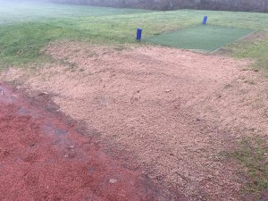 The old Astro-turf tee mat on the first tee has been removed and replaced with a new mat. Work has continued on the path sides and will be ongoing until all work is complete.