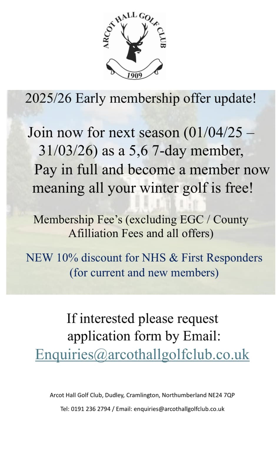 Tel: 0191 236 2794 option 2 or Email: enquiries@arcothallgolfclub.co.uk
